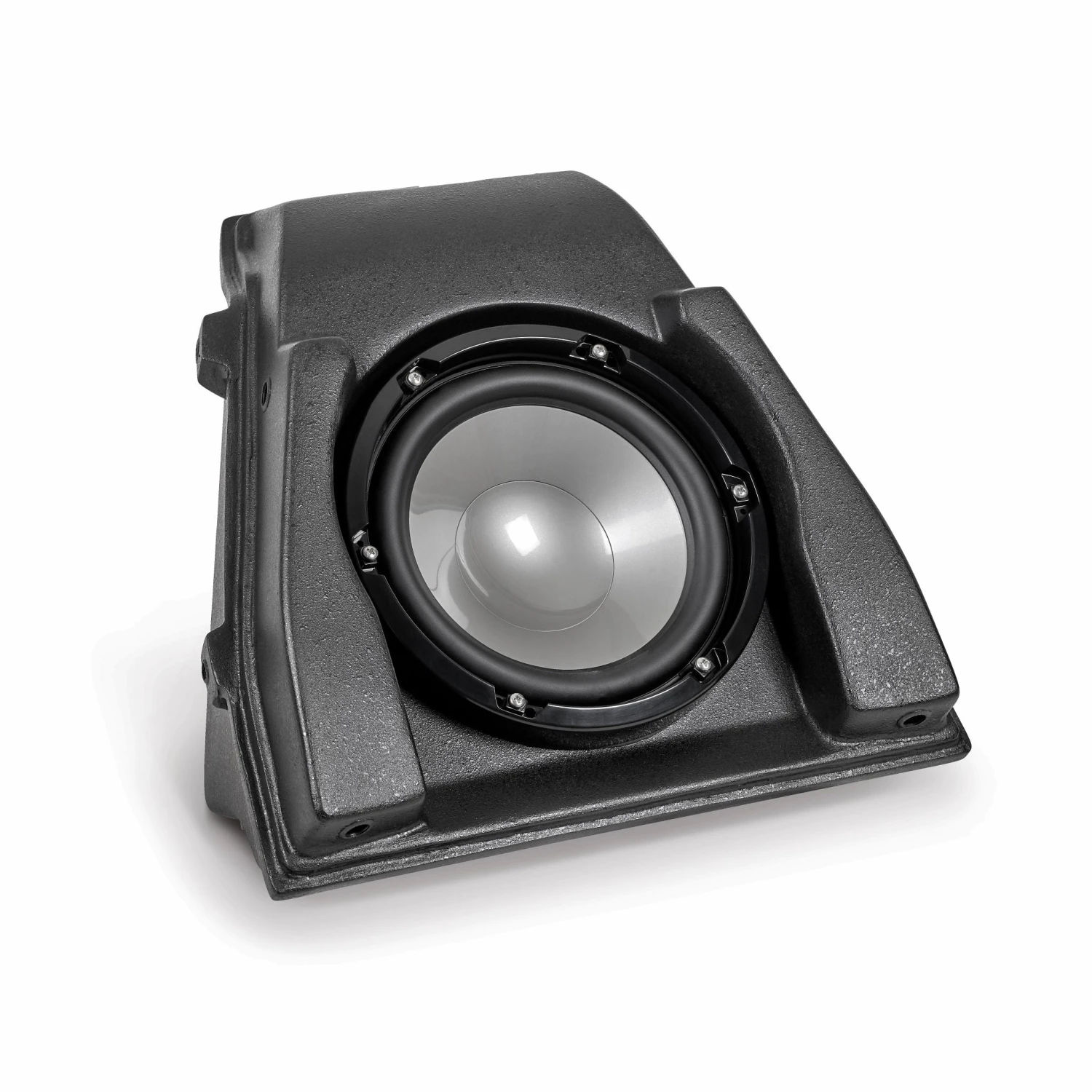 Subwoofer enclosure includes integrated storage tray and replacement 12V outlet.Â